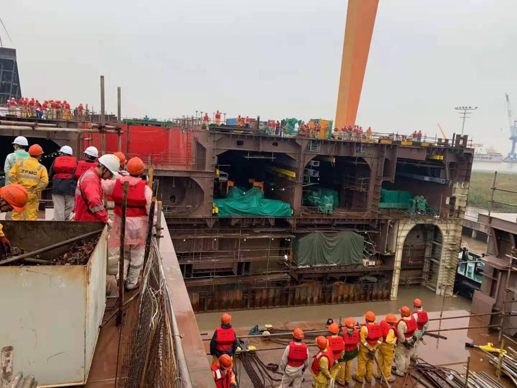 南通豪通船務(wù)有限公司承接了“JSD6000鋪管船”總段對接合攏工程。針對該項工作量大,環(huán)境復(fù)雜,工期緊的特點,公司“調(diào)兵遣將”安排最優(yōu)秀的班組負(fù)責(zé)該工程,各級人員也充分發(fā)揮不怕苦,不怕累的精神,夜以繼日、保質(zhì)保量的完成了振華重工安排給我們的任務(wù),確保了該船能夠順利下水,同時公司也受到振華和船東一致好評。